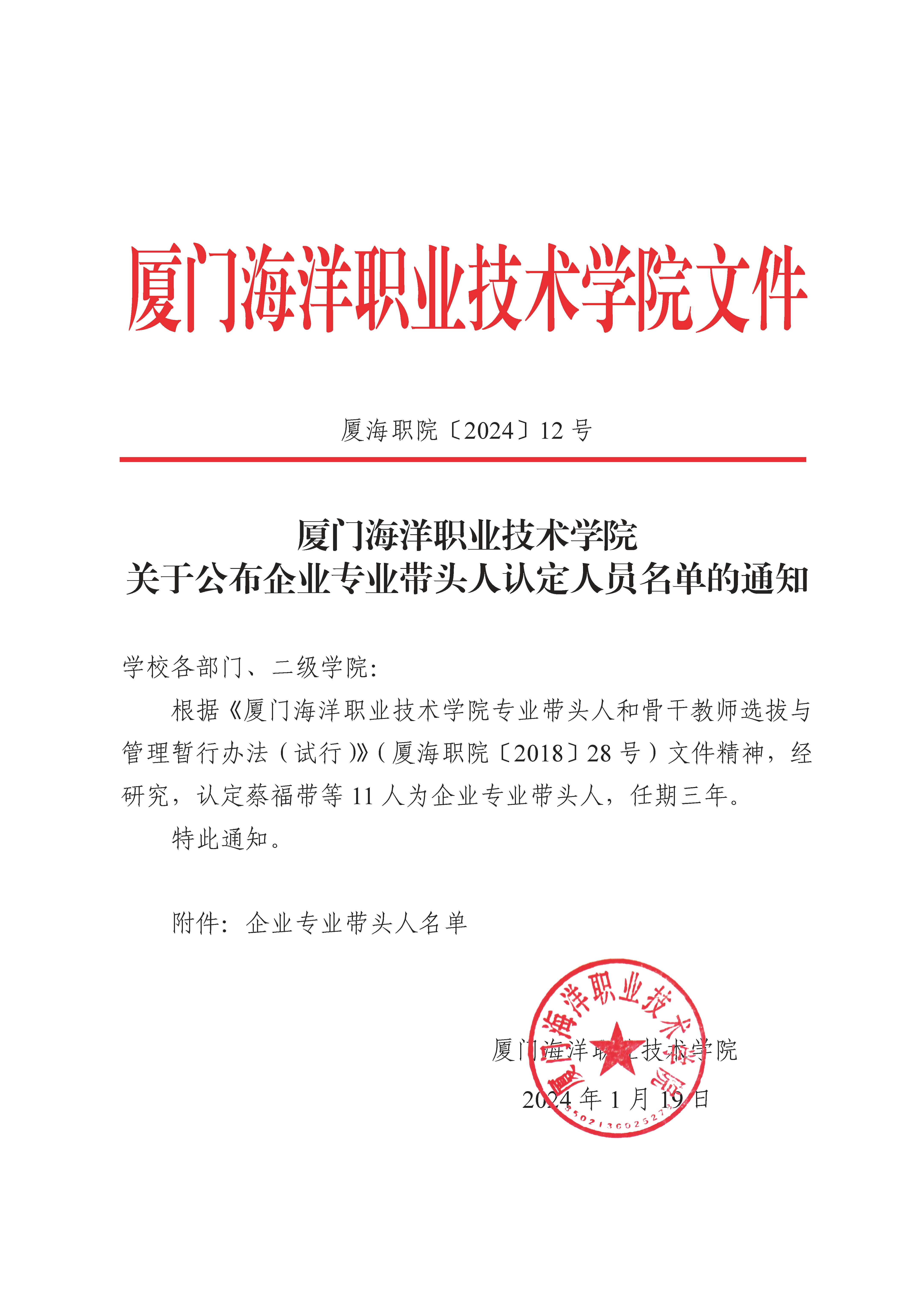 1月19日,廈門海洋職業(yè)技術(shù)學院公布企業(yè)專業(yè)帶頭人認定人員名單的通知,根據(jù)《廈門海洋職業(yè)技術(shù)學院專業(yè)帶頭人和骨干教師選拔與管理暫行辦法(試行)》(廈海職院〔2018〕28號)文件精神,認定鳳凰創(chuàng)壹董事長林慶平等11人為企業(yè)專業(yè)帶頭人,任期三年。