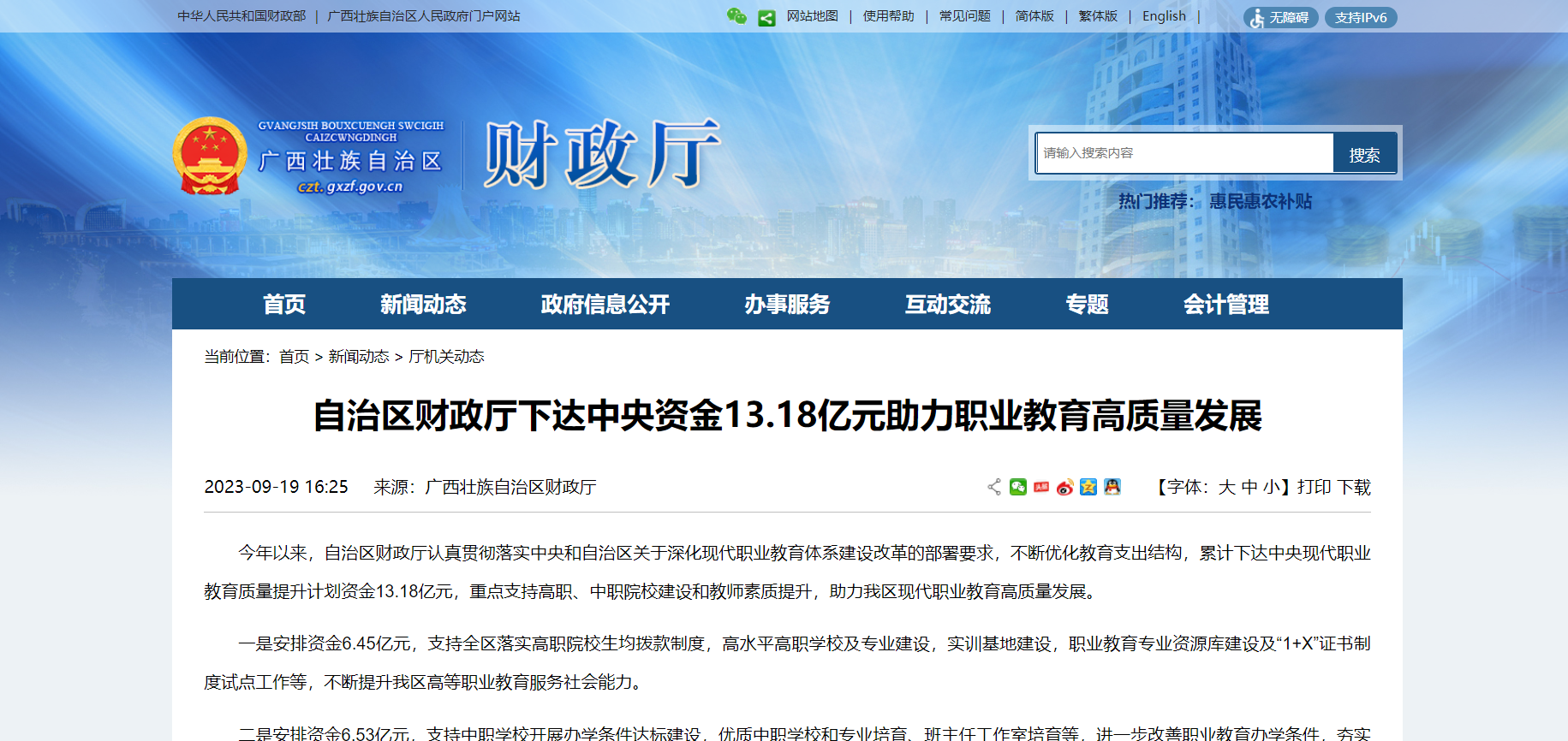 從廣西壯族自治區(qū)財政廳獲悉,今年以來,自治區(qū)財政廳累計下達中央現(xiàn)代職業(yè)教育質(zhì)量提升計劃資金13.18億元,重點支持高職、中職院校建設和教師素質(zhì)提升,助力廣西現(xiàn)代職業(yè)教育高質(zhì)量發(fā)展。