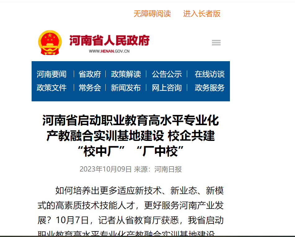按照計劃,河南省將在全省布局建設不少于60個創(chuàng)新資源匯聚能力突出、產教融合示范作用顯著、服務區(qū)域和經(jīng)濟發(fā)展成果卓越的高水平專業(yè)化產教融合實訓基地。2023年,擬在全省高等職業(yè)學校中遴選建設30個左右高水平專業(yè)化產教融合實訓基地。
