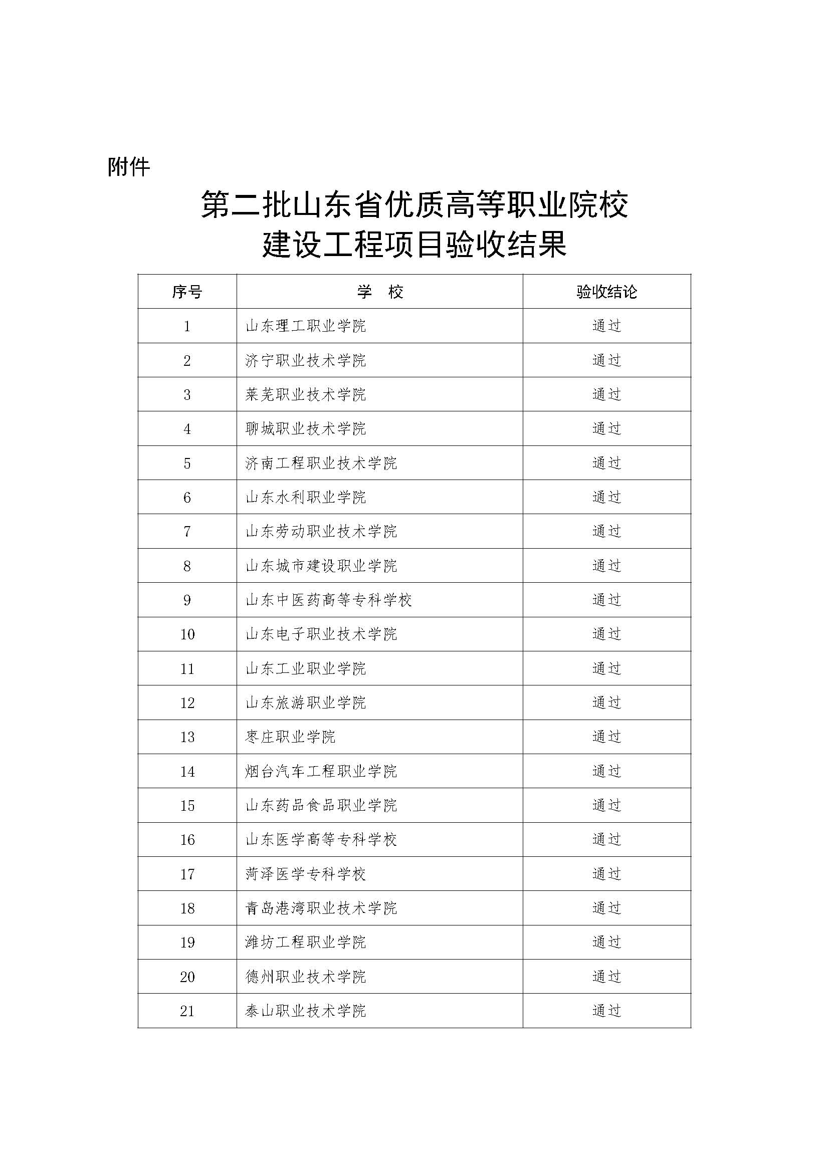 根據(jù)山東省優(yōu)質(zhì)高等職業(yè)院校建設(shè)工程實(shí)施管理規(guī)定,在學(xué)校自評(píng)、項(xiàng)目審計(jì)基礎(chǔ)上,我廳組織專家采取現(xiàn)場(chǎng)評(píng)估方式,對(duì)第二批立項(xiàng)建設(shè)的省優(yōu)質(zhì)高職院校進(jìn)行了驗(yàn)收。按照《山東省教育廳 山東省財(cái)政廳關(guān)于實(shí)施山東省優(yōu)質(zhì)高等職業(yè)院校建設(shè)工程的通知》(魯教職字〔2017〕4號(hào))相關(guān)規(guī)定,依據(jù)專家驗(yàn)收結(jié)果,21所立項(xiàng)建設(shè)的第二批省優(yōu)質(zhì)高職院校全部驗(yàn)收通過(guò),授予“山東省優(yōu)質(zhì)高等職業(yè)院?!狈Q號(hào)。驗(yàn)收結(jié)果經(jīng)公示無(wú)異議,現(xiàn)予以公布(見(jiàn)附件)。