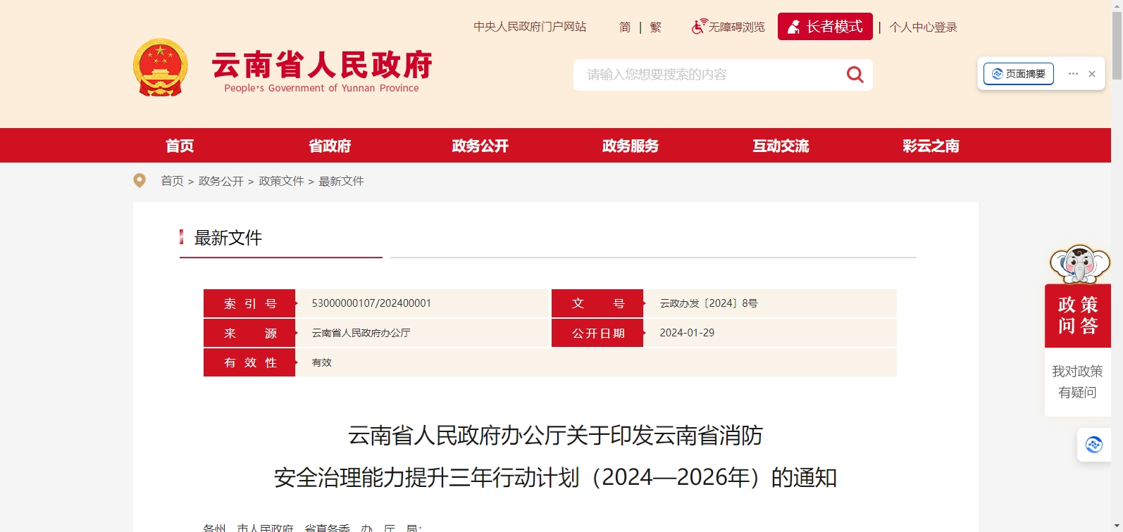 云南省人民政府辦公廳關(guān)于印發(fā)云南省消防 安全治理能力提升三年行動(dòng)計(jì)劃(2024—2026年)的通知
