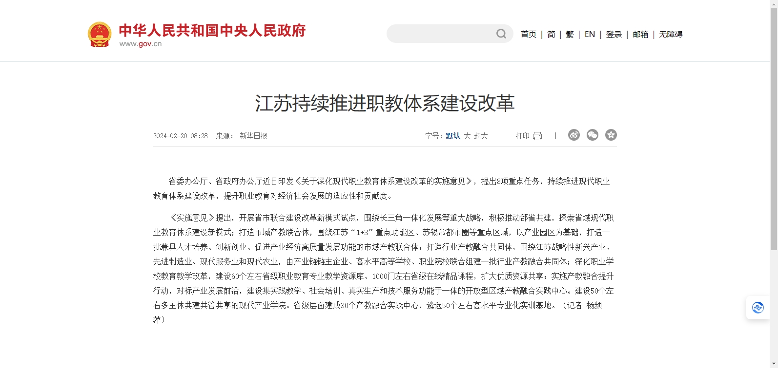 江蘇省省委辦公廳、省政府辦公廳近日印發(fā)《關(guān)于深化現(xiàn)代職業(yè)教育體系建設(shè)改革的實(shí)施意見(jiàn)》,提出8項(xiàng)重點(diǎn)任務(wù),持續(xù)推進(jìn)現(xiàn)代職業(yè)教育體系建設(shè)改革,提升職業(yè)教育對(duì)經(jīng)濟(jì)社會(huì)發(fā)展的適應(yīng)性和貢獻(xiàn)度。