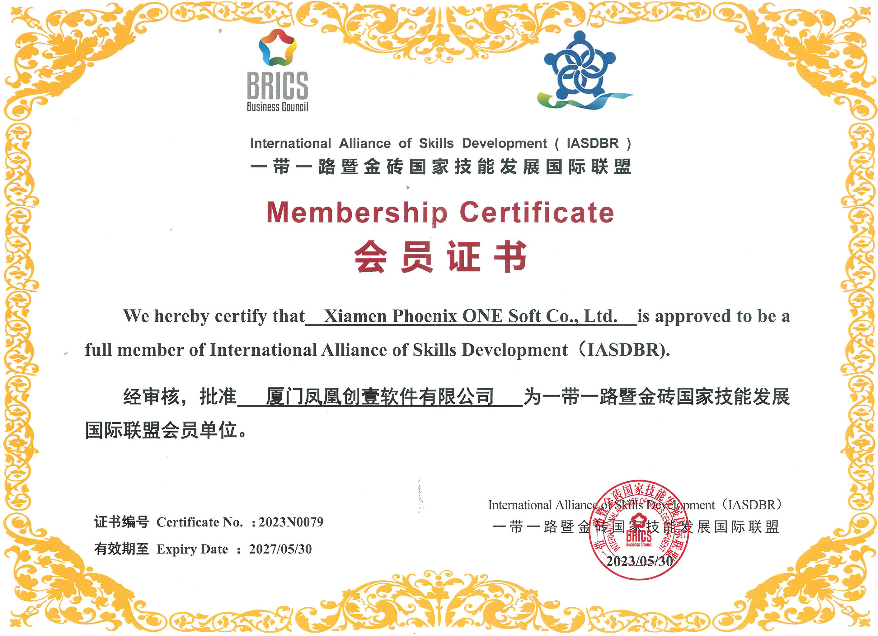 喜報!鳳凰創(chuàng)壹獲頒一帶一路暨金磚國家技能發(fā)展國際聯盟成員單位證書