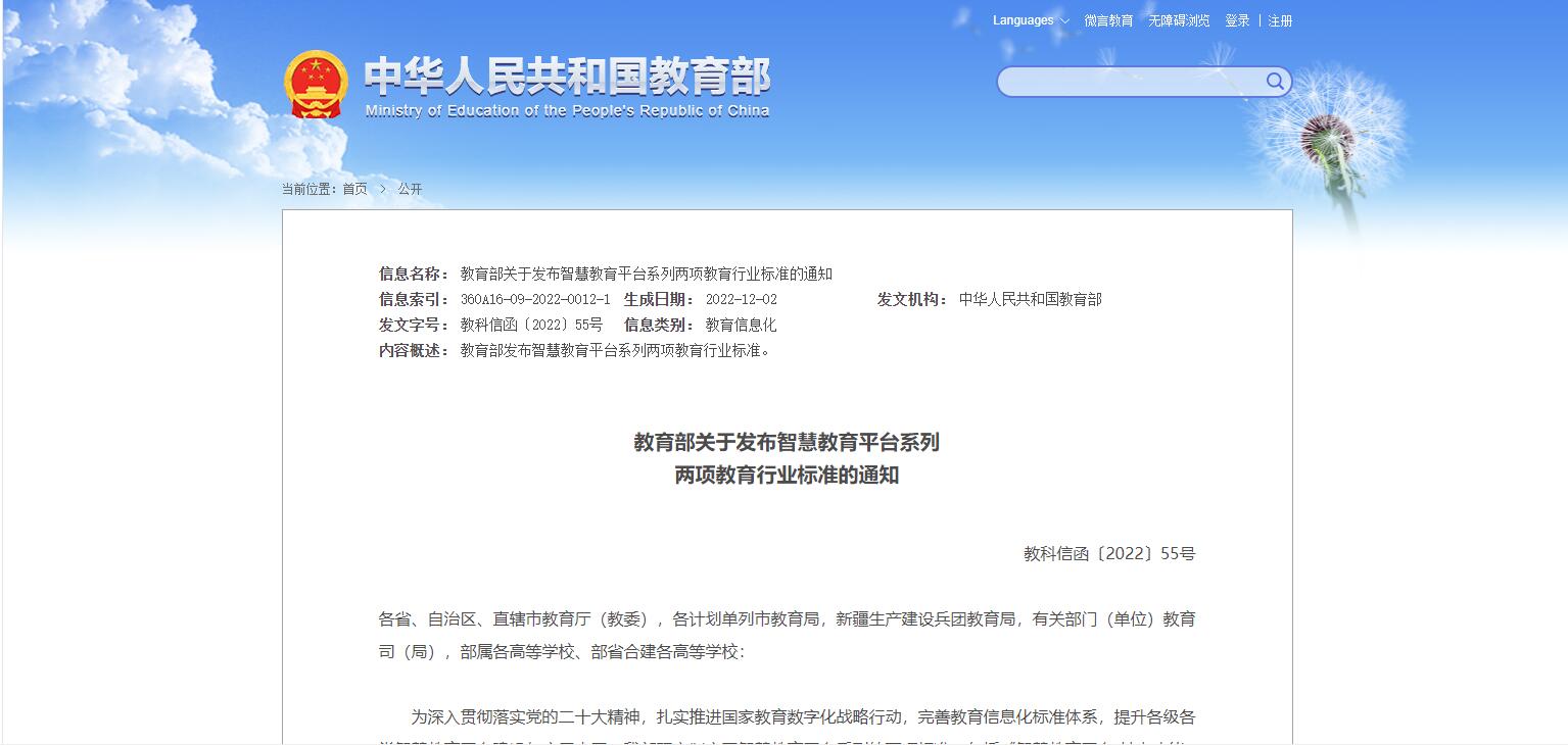 教育部關于發(fā)布智慧教育平臺系列兩項教育行業(yè)標準的通知
