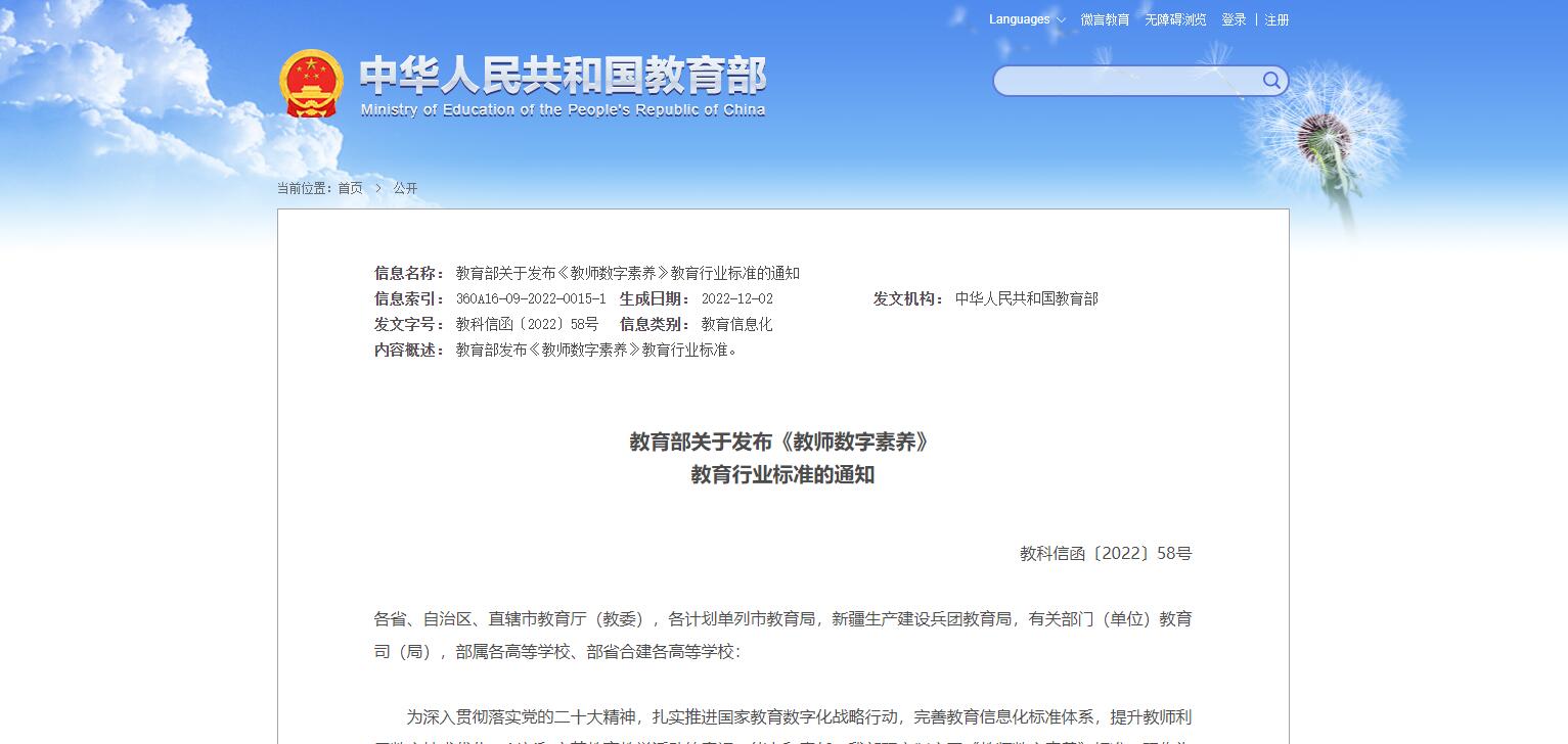 教育部關于發(fā)布《教師數(shù)字素養(yǎng)》教育行業(yè)標準的通知