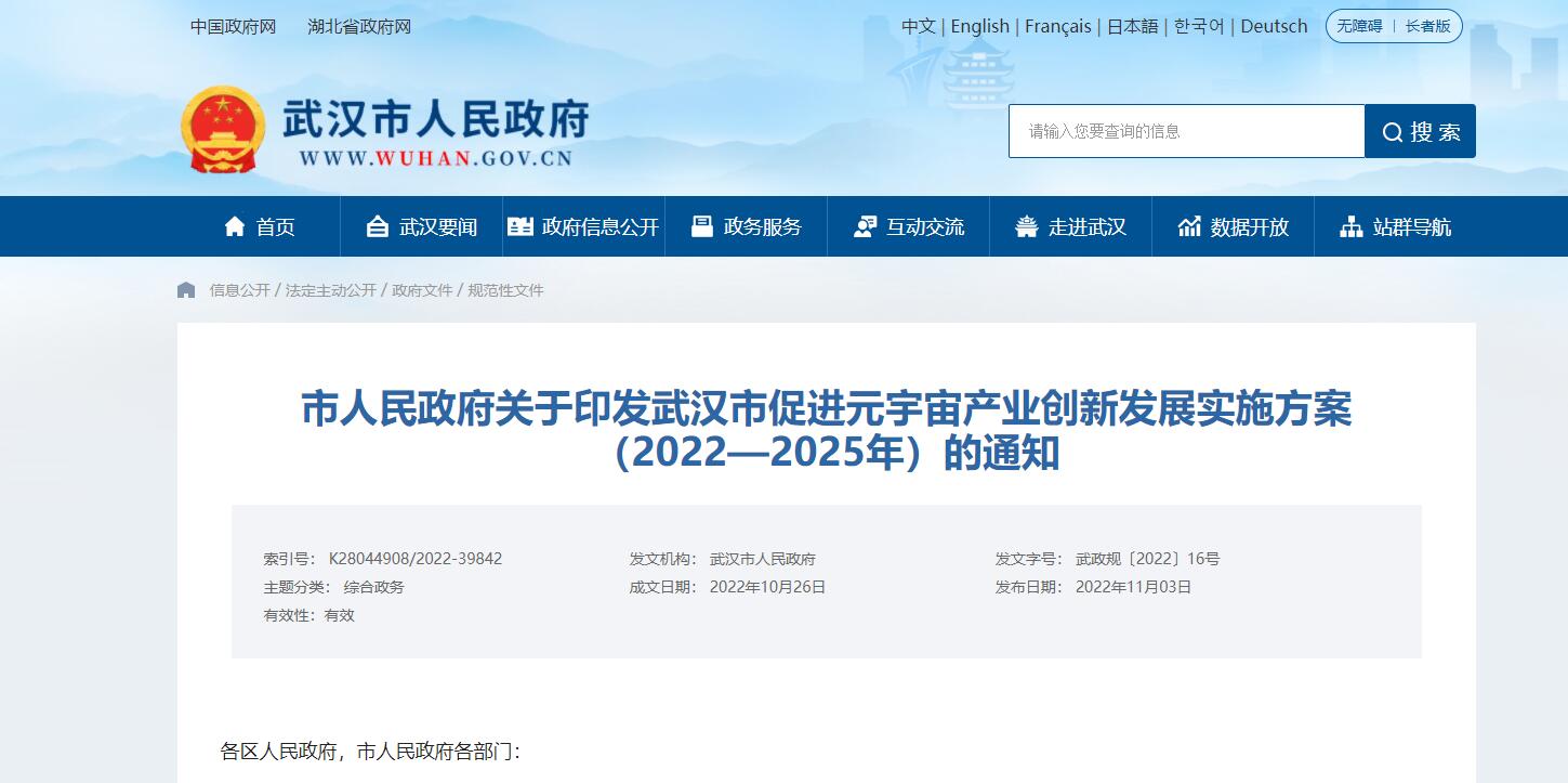 各區(qū)人民政府,市人民政府各部門: 經研究,現(xiàn)將《武漢市促進元宇宙產業(yè)創(chuàng)新發(fā)展實施方案(2022—2025年)》印發(fā)給你們,請認真組織落實。 武漢市人民政府 2022......